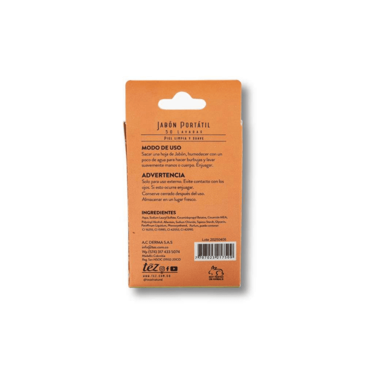 Complementa tu cuidado diario con las Tez Hojas de Jabón, el aliado perfecto para mantener tus manos limpias y cuidadas en todo momento. Su estuche compacto y libre de parabenos las hace ideales para llevar en el bolso y usar en cualquier lugar, asegurando limpieza y frescura al instante.