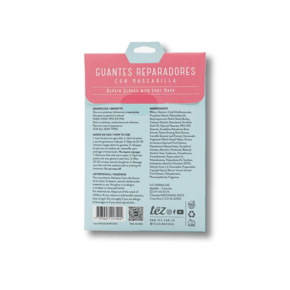 Devuélvele a tus pies la suavidad y frescura con los Guantes Antiedad para Pies TEZ, diseñados para hidratar profundamente y recuperar la textura natural de la piel. Su fórmula combina manteca de karité, aceites de almendras, macadamia y camelia, junto con ácido hialurónico, brindando nutrición intensa y un acabado sedoso.